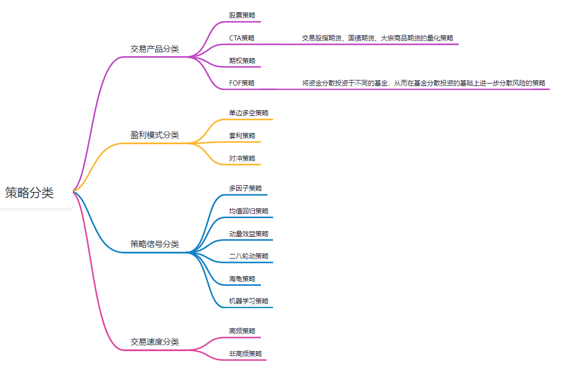 参考知乎上的常见量化交易策略分类一文,量化策略可以按照交易产品、盈利模式、策略信号、交易速度进行分类,具体分类如下: