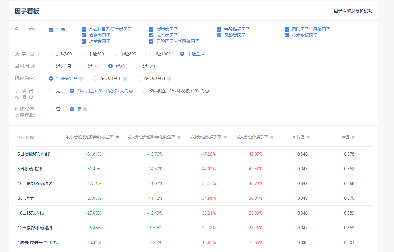 此网页为聚宽提供的因子看板,提供了聚宽支持的因子,以及聚宽提前计算好的因子结果,可以通过查询即可知道因子的效果。